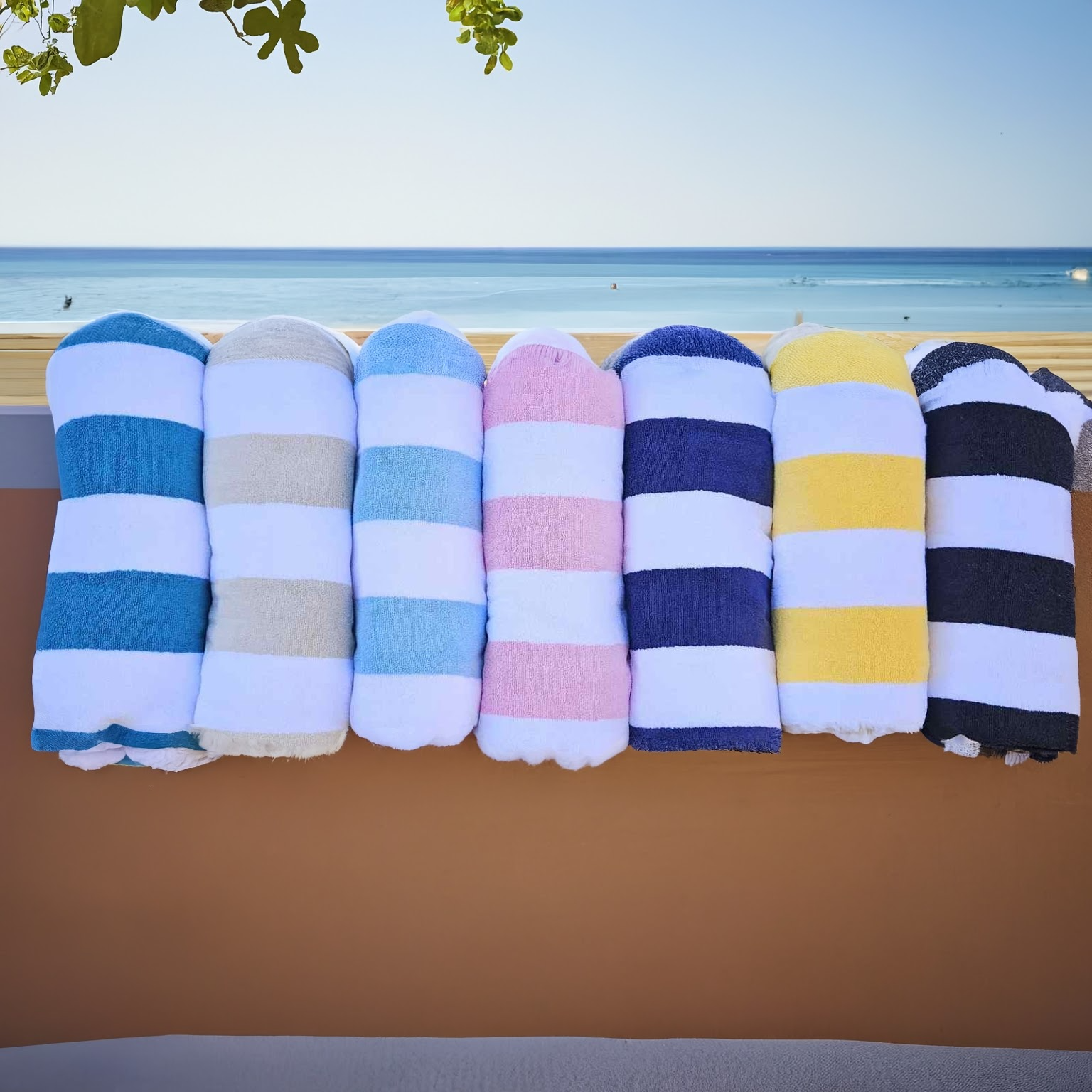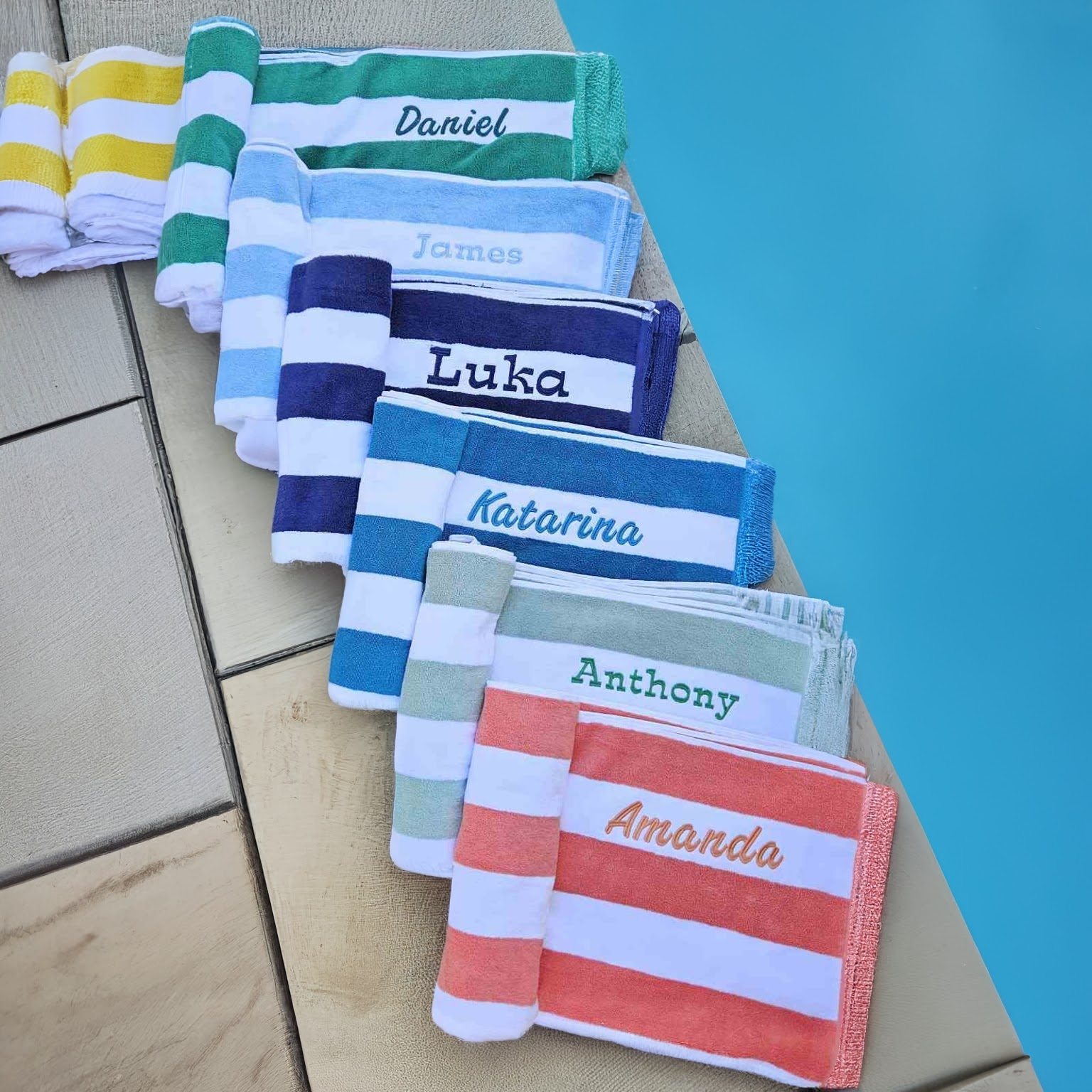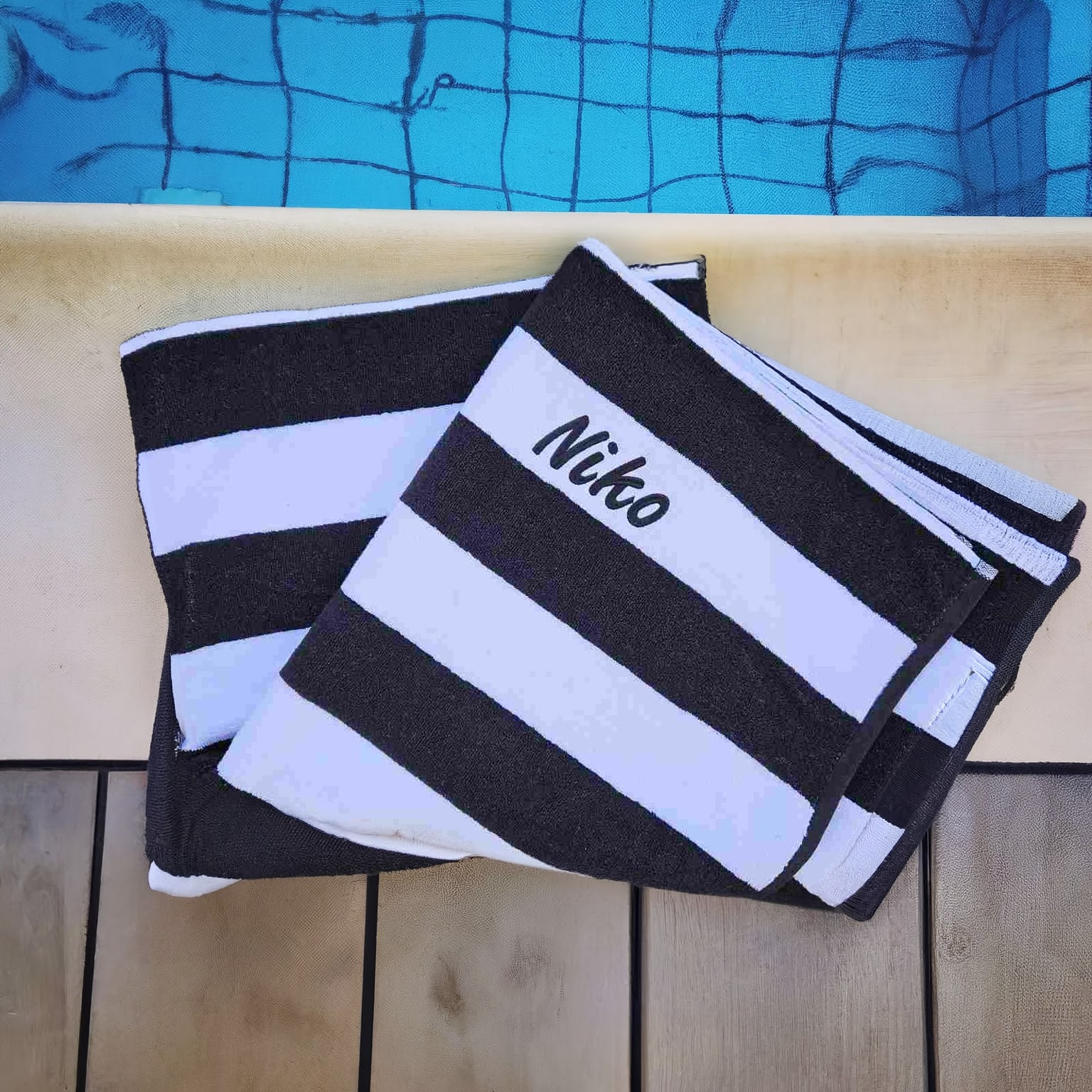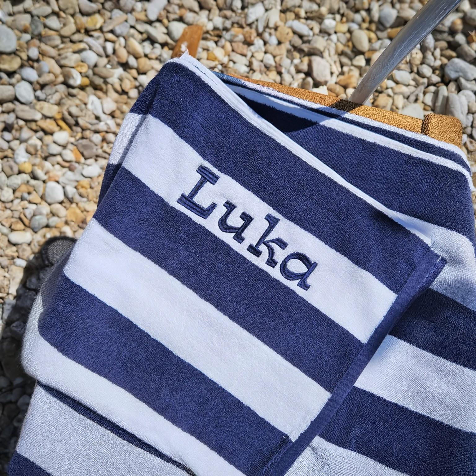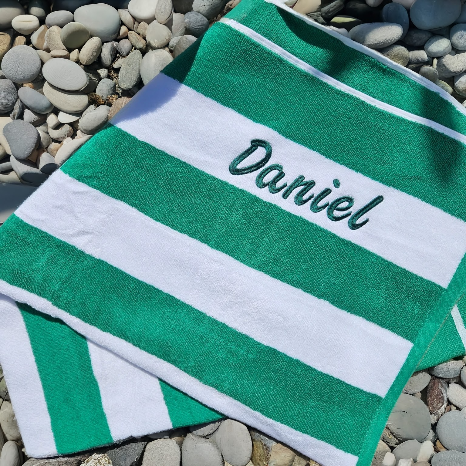 Make a splash this summer with our personalised striped beach towels – super soft, 100% cotton, and generously sized at 80 x 160cm. Suitable for kids and adults alike, each towel is custom embroidered with a name in matching thread for a stylish, one-of-a-kind finish.